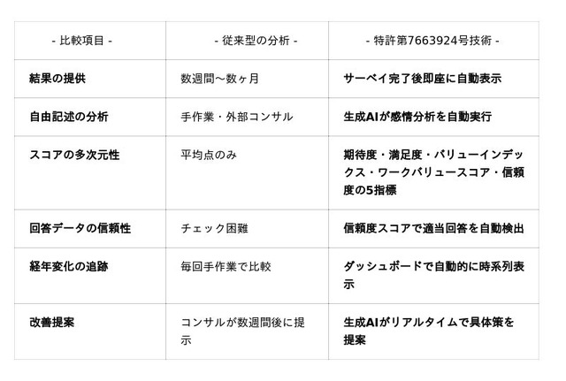 本特許技術は、エンゲージメントサーベイの回答データから「期待度・満足度・バリューインデックス・ワークバリュースコア・信頼度スコア」という5つの独自指標を算出し、組織の強みと課題を多次元ダッシュボードで即座に可視化する技術です。感情分析を組み込んだスコアリングと経年推移の自動可視化により、従来のコンサルタント分析に代わる、迅速かつ精密な組織診断を実現します。