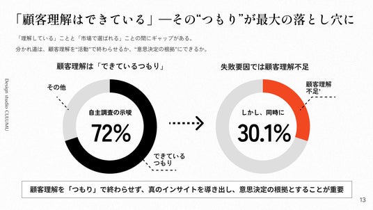 72.3%の企業が「顧客を十分理解している」と自負する一方、実際の事業失敗要因の第1位は「市場ニーズの欠如(30.1%)」。 企業側の思い込みが浮き彫りになりました。
