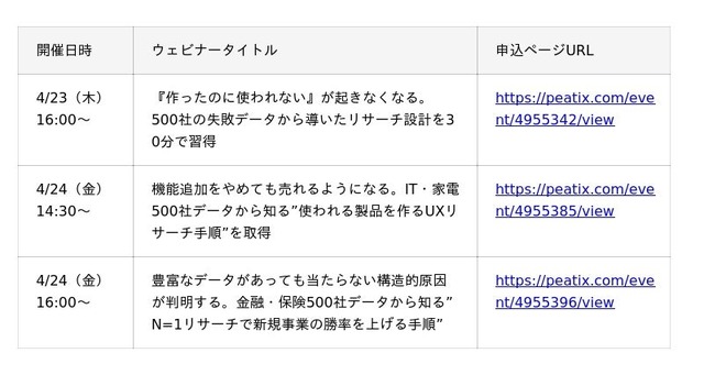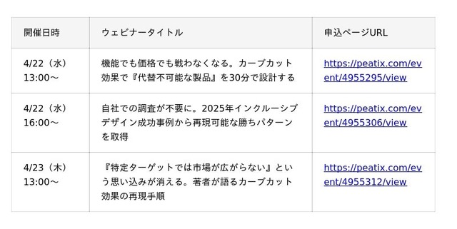 調査から見えた「顧客理解の錯覚」や「幻滅の谷」に対し、企業は具体的にどうアプローチすればよいのでしょうか。本ウェビナーシリーズでは、調査結果の単なる解説にとどまらず、自社の事業開発に落とし込むための実践手法をお伝えします。 課題の性質に合わせ、3つの切り口から全7回のプログラムをご用意しました。