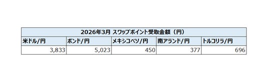 SBI FXトレード株式会社(本社:東京都港区、代表取締役社長:藤田 行生、以下「当社」)は、2026年3月のFX取引におけるスワップポイントの実績を公表しましたことをお知らせいたします。