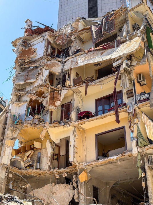 大規模な空爆により、深刻な被害を受けたベイルートにある集合住宅の建物(レバノン、2026年4月9日撮影) (C) UNICEF/UNI975452/Choufany