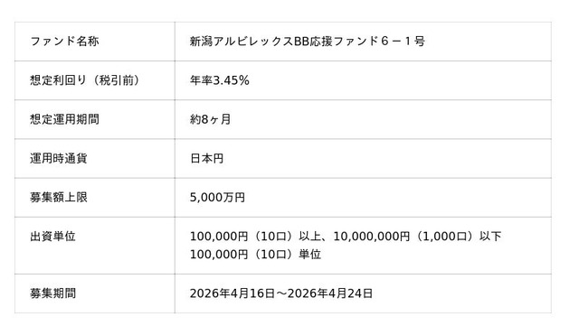 「未来をわかちあう投資」を提供する「Funvest(ファンベスト)」(以下、Funvest)は、「新潟アルビレックスBB応援ファンド6-1号」(以下、本ファンド)の募集を4/16より開始しますので、お知らせいたします。