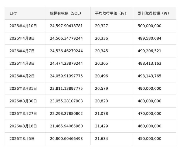 株式会社WIZE(旧:株式会社モブキャストホールディングス、本社:東京都渋谷区、代表取締役CEO:藪 考樹、証券コード:3664、以下「当社」)は、2025年10月24日より暗号資産ソラナ(SOL)の取得を進めてまいりましたが、2026年4月10日をもって累計取得金額が5億円(保有量:24,500 SOL超)に到達いたしましたので、お知らせいたします。