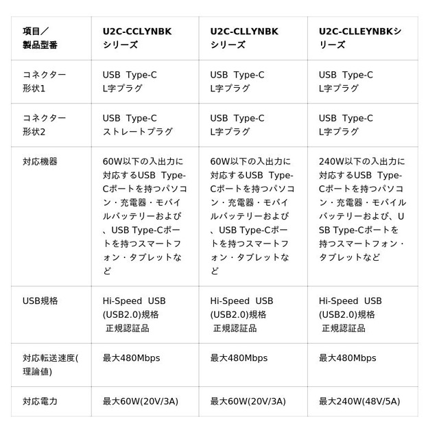 コネクター形状とUSB Power Deliveryの対応電力が異なる3タイプをラインアップしました。片側L字+片側ストレートの最大60W対応タイプと、両端L字コネクターの最大60W対応タイプ、最大240W対応タイプを用意し、用途に合わせて長さも選べます。いずれもUSB-IF正規認証品で、2重シールドケーブル、金メッキピン、難燃性素材を採用した安心設計です。