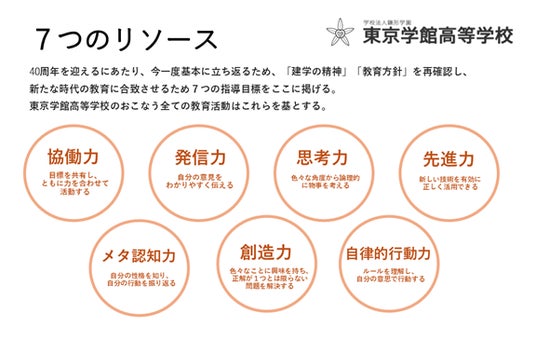 東京学館高等学校は、1979年に開校した共学の私立高校で、教育方針として「7つのリソース」(「協働力」「発信力」「思考力」「先進力」「メタ認知力」「創造力」「自律的行動力」)を掲げています。