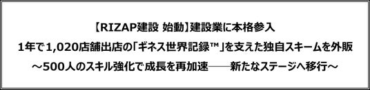 併せて、この驚異的な出店スピードとコスト効率を実現した独自の店舗開発スキームを、建設業界の深刻な課題解決に役立てるべく、「RIZAP建設株式会社」(代表取締役社長:幕田 純、以下「RIZAP建設」)を通じて外販を開始し、リスキリングによるリスキリングプラットフォームを構築することで、建設業界の人手不足や雇用のミスマッチといった社会課題の解決を目指してまいります。