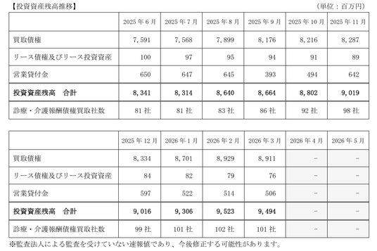 2026年3月は、債権買取社数が1社解約で減少し、3月末で101社となりました。投資資産残高は、買取債権が18百万円減少し、営業貸付金の回収もあり、投資資産残高合計で前月末比29百万円減少し9,494百万円となりました。