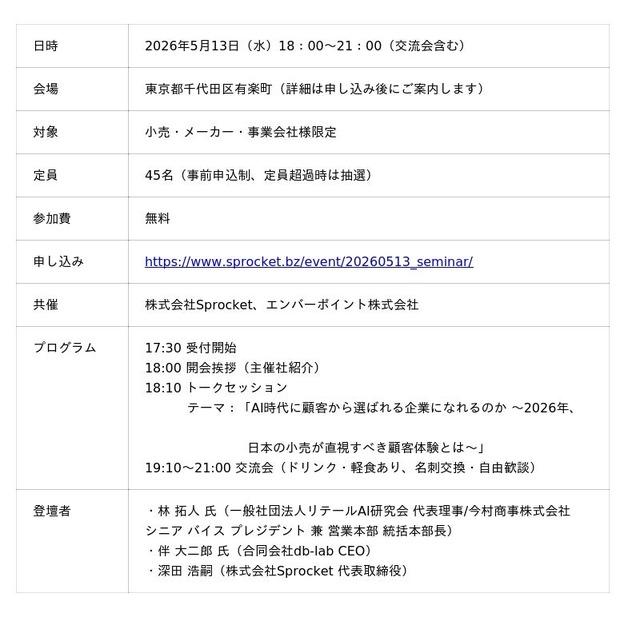 小売・EC・ブランド企業の経営層および事業責任者を対象としたビジネス交流会「AI時代に顧客に選ばれる企業になれるのか~2026年、日本の小売が直視すべき顧客体験~」をAIが消費者の購買行動に深く関わるようになる中、企業がいかに顧客との関係を築き、選ばれ続けるかをテーマに、業界の実務に精通した3名の登壇者とともに議論します。