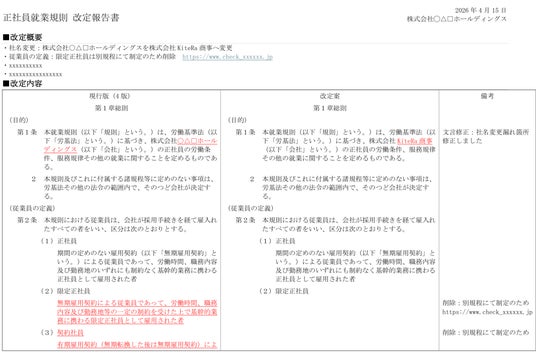 「安心して働ける世界をつくる」をミッションに掲げ、社内規程DXサービス「KiteRa Biz(キテラビズ)」と社労士向けサービス「KiteRa Pro(キテラプロ)」を提供する株式会社KiteRa(代表取締役 執行役員 CEO:植松隆史、本社:東京都港区、読み:キテラ、以下「当社」)は、規程改定時の説明・報告に必要な情報を整理する「改定報告書」および「制定・改定規程一覧」機能の提供を開始しました。