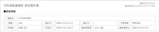 これにより、規程改定時の変更点やその背景、対象期間中に制定・改定された規程の一覧を整理した資料を作成しやすくなり、役員会や各種会議体における承認・決裁に向けた説明・報告を円滑化します。