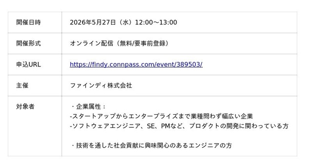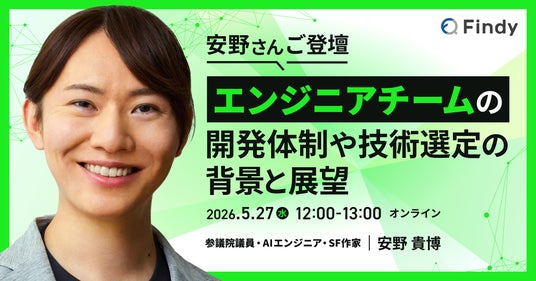 エンジニアプラットフォームを提供するファインディ株式会社(東京都品川区、代表取締役:山田 裕一朗、以下「当社」)は、2026年5月27日(水)に開催するオンラインイベントの参加申し込み受付を、本日より開始したことを発表します。本イベントは、チームみらい党首であり参議院議員の安野 貴博氏をお招きし、エンジニアチームの開発体制や技術選定の背景と展望をお話しいただきます。