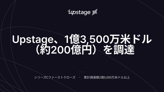 Upstageは本日、シリーズCファーストクローズとして 1億3,500万米ドル(約200億円) の調達完了を発表しました。これにより累計調達額は 約2億7,000万米ドル(約400億円) に達します。本ラウンドはSazzePartnersをリードインベスターとし、アジアを中心とする有力金融投資家が参画。今回の調達により、Upstageは企業評価額10億ドル超を達成し、ユニコーン企業となりました。