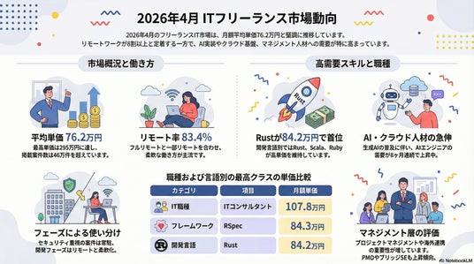 INSTANTROOM株式会社(本社:東京都渋谷区、代表取締役:曽根弘介)が運営する、フリーランスエンジニア・ITフリーランスの案件検索サイト「フリーランスボード(https://freelance-board.com)」は2026年4月のフリーランス案件の単価における市場動向の調査結果を発表いたします。