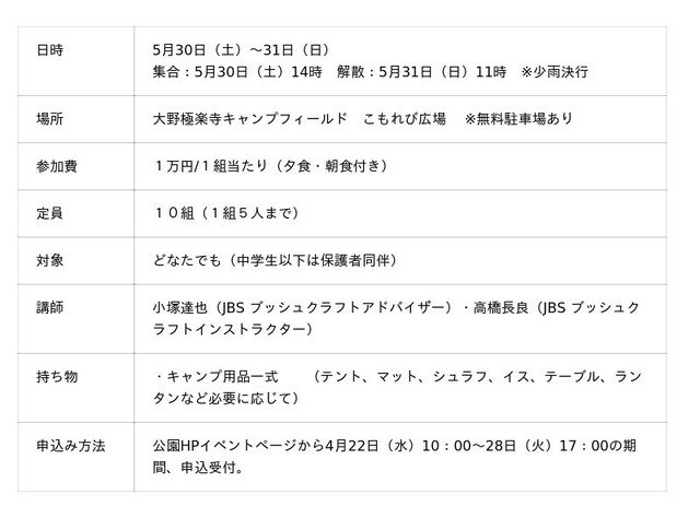 大野極楽寺公園キャンプ場 プレオープン企画「初めてのキャンプ体験会」開催 - PR TIMES|RBB TODAY