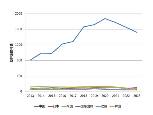 国別の出願件数では、全体の過半数を中国が占めています。本分野における研究開発の中心となっており、近年も一貫した増加傾向にあります。