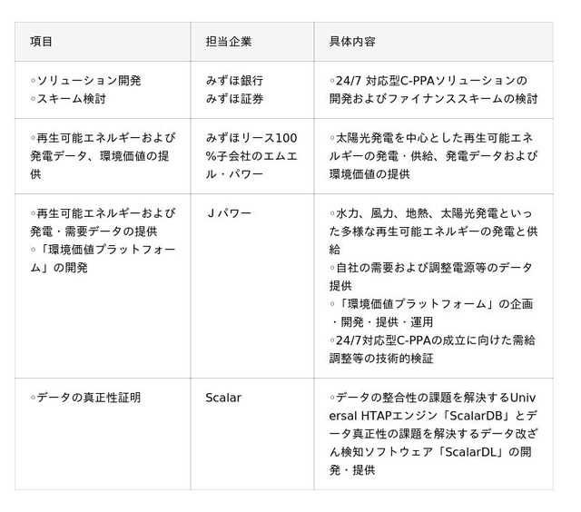 株式会社みずほ銀行(取締役頭取:加藤 勝彦、以下「みずほ銀行」)、みずほ証券株式会社(取締役社長:浜本 吉郎、以下「みずほ証券」)、みずほリース株式会社(代表取締役社長:中村 昭、以下「みずほリース」)、電源開発株式会社(代表取締役社長 社長執行役員:加藤 英彰、以下「Jパワー」)、および株式会社Scalar(代表取締役CEO:深津 航、以下「Scalar」)の5社(以下「共同実証者」)は、企業が使用する電力を24時間365日、常にカーボンフリー電力で賄う「24/7CFE(Carbon-Free-Energy)」の実現に不可欠な、時間単位での需給マッチング(Hourly Matching)の 実証に成功しました。本実証は複数の発電事業者と非化石電源種を組み合わせて実施したものです。