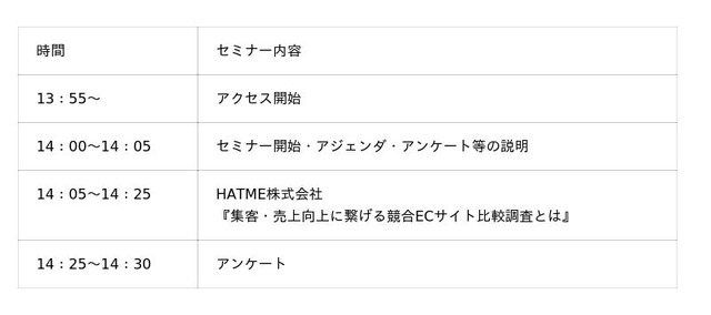 マーケティングアソシエーション株式会社の子会社であるHATME株式会社(本社:東京都台東区 代表取締役:中園広和、以下当社)は2026年5月1日(金)に、ウェブセミナー「【運用中の方必見】競合ECサイト比較調査で差別化EC戦略!自社ECの現状と改善ポイントがまるわかり」を、開催いたします。