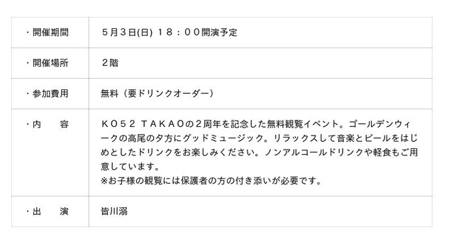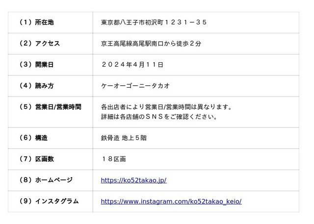 株式会社京王SCクリエイション(本社:東京都渋谷区、代表取締役社長:小堺 健司)は、京王高尾線高尾駅前にある商業施設「KO52 TAKAO(以下、本施設)」において、5月2日(土)~5月6日(水)の期間で、「52WEEK(以下、本イベント)」を開催します。