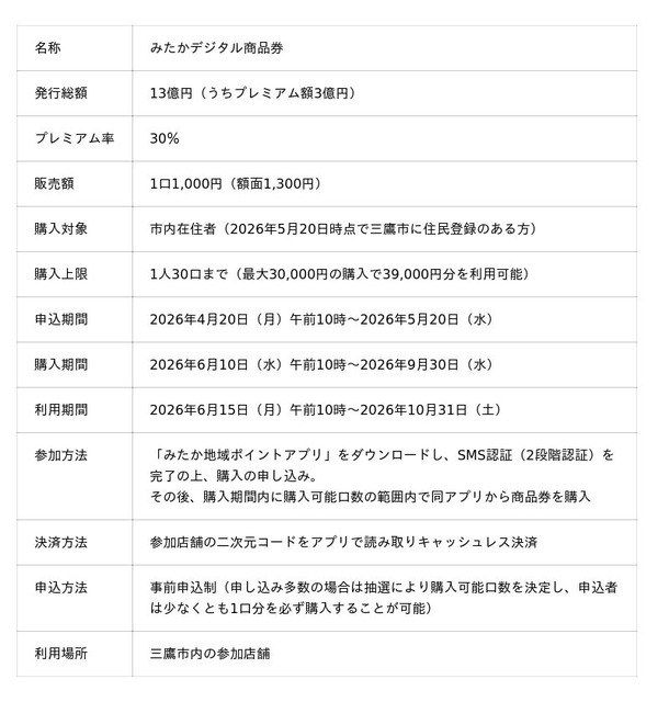 このたび、三鷹市が国の重点支援地方交付金を活用して実施する「みたかデジタル商品券」について、2026年4月20日午前10時より、市内在住者を対象とした購入申込をアプリ内で開始しますので、お知らせします。