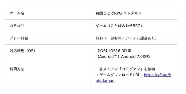 スマートフォンで遊べる「ことば」で闘う新感覚RPGです。文字の精霊「コトダマン」を組み合わせて「ことば」をつくり、ステージクリアを目指します。つくった「ことば」の長さや数で敵に与えるダメージが変化し、最大4人で協力しながら遊ぶマルチプレイでは、友だちや家族とワイワイ盛り上がりながら、それぞれの知識を出し合って「ことば」づくりを楽しむことが可能です。生き物、食べ物、地名、歴史上の人物から、流行のあの「ことば」まで、29万語以上に対応。「ことば」は日々追加しており、無限に楽しみが広がる、究極のことば遊びゲームです。2025年10月時点で、累計利用者数600万人を突破しています。