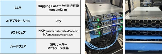 本サービスは標準構成として、「Llama」や「tsuzumi 2」をはじめとするLLMを、NutanixのAIプラットフォーム上のGPU基盤で提供します。必要なサーバやAIアプリケーションをあらかじめ設定した状態でお客様へ届けるため、お客様は迅速にAI環境を試すことができます。