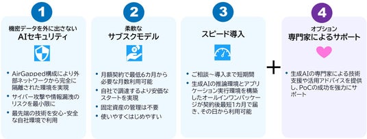 生成AIの推論環境とアプリケーション実行環境を構築したオールインワンパッケージが、契約後最短1カ月で届き、届いたその日から利用可能です。