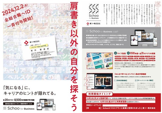 インターネットでの学びや教育を起点とした社会変革を行う株式会社Schoo(本社:東京都渋谷区、代表取締役社長:森 健志郎、以下「スクー」)は、東ソー株式会社(本社:東京都中央区、代表取締役社長:桒田 守、以下 「東ソー」)に対し「Schoo for Business」を提供し、社員一人ひとりの主体的な学びを支える基盤構築を支援しています。