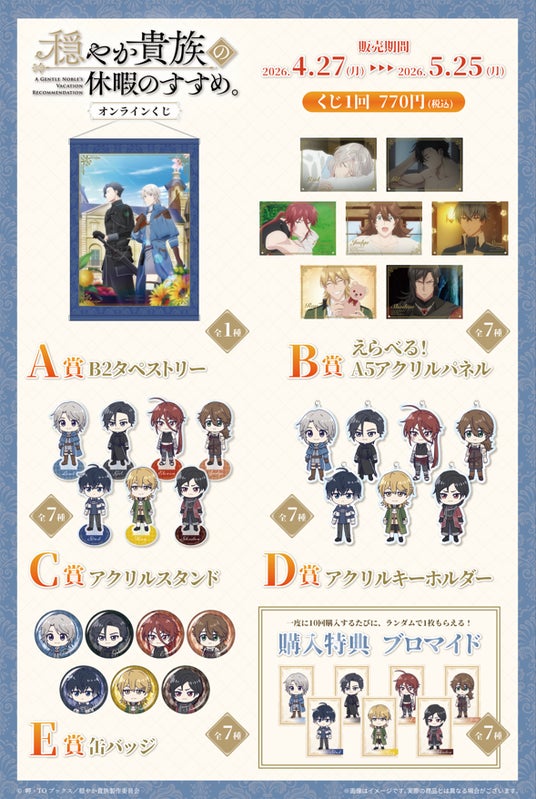 ファッション・アパレル雑貨を中心に企画・製造・販売など、国内外のブランドのOEM事業を手がけるイエロー株式会社(本社:東京都渋谷区 代表取締役:阪崎英一郎、以下「当社」)は、同社が展開するオンラインくじサービス「ガラくじONLINE」にて、アニメ『穏やか貴族の休暇のすすめ。』の豪華賞品が当たる〈アニメ『穏やか貴族の休暇のすすめ。』オンラインくじ〉を、2026年4月27日(月)12時より販売開始いたします。