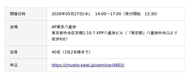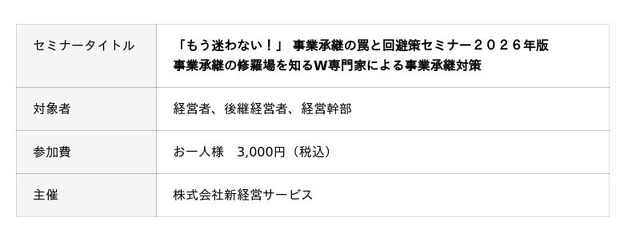 経営革新や、補助金の活用、事業承継コンサルティングに強みがある、株式会社新経営サービス(本社:京都府京都市、代表取締役社長:森谷克也)は、株式会社青山財産ネットワークスの渡邉章治氏を迎え「『もう迷わない!』 事業承継の罠と回避策セミナー」を、2026年5月27日(水)14:00~17:00に開催いたします。