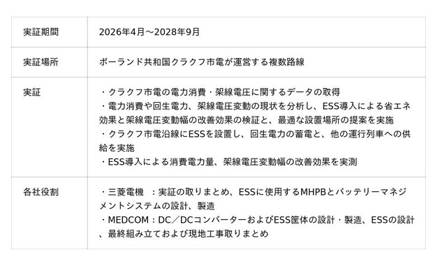 新サービスは、ESSで回生エネルギーの余剰電力(余剰回生電力)の有効活用を行うもので、本実証は、ポーランドのクラクフ市で市電やバスを運営するMiejskie Przedsiębiorstwo Komunikacyjne S.A. w Krakowie(ミエイスキエ・プシェドシェンビオルストフォ・コムニカチィネ・エス・アー・ヴ・クラコヴィエ、本社:ポーランド共和国クラクフ市、以下、MPK社)と同市道路管理局 Zarząd Drog Miasta Krakowa(ザジョンド・ドルッグ・ミアスタ・クラコヴァ、本社:ポーランド共和国クラクフ市、ZDMK社)の協力のもと、当社および当社関係会社MEDCOM Sp. z o.o.(メドコム、本社:ポーランド共和国マゾフシェ県、以下、MEDCOM)が実施するものです。