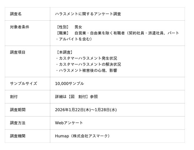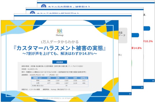 株式会社アスマーク(本社:東京都渋谷区、代表取締役:町田正一)が展開する、従業員総活躍サービス「Humap(ヒューマップ)」は、全国の有職者10,000人を対象に実施した「カスタマーハラスメント(カスハラ)被害の実態調査」のレポートを4月10日(金)に公開いたしました。