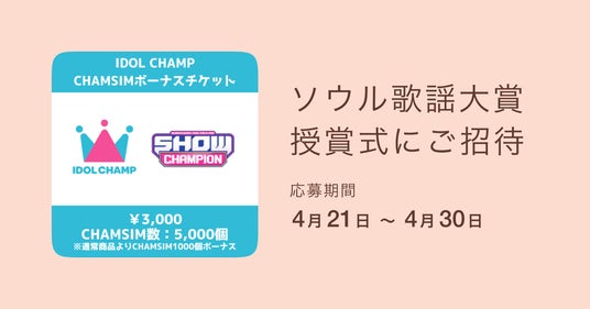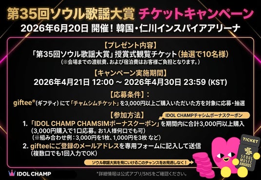 K-POPアイドルファンダムアプリ「IDOL CHAMP」は、eギフトプラットフォーム事業を展開する株式会社ギフティが運営するeギフト販売サービス「giftee(R)」において、「第35回ソウル歌謡大賞」の授賞式観覧チケットが抽選で10名様に当たるプレゼントキャンペーンを、2026年4月21日(火)より開始いたします。