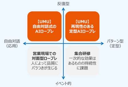UMUのAIロープレでは、相手を用意しなくても練習できるいつでも、何度でも、同じ条件でロープレできるため、「時間が空いたら練習する」「うまくいかなかった点をすぐ試す」というサイクルが日常になります。ロープレが“イベント”から“習慣”に変わることで、学習量そのものが大きく変わります。