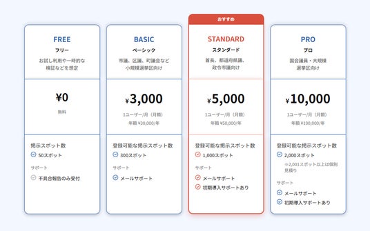 ポスどこは活動規模に応じて選択しやすい料金体系を用意しています。議員の種類や政治活動の方法などによりさまざまなニーズが存在するため、これから選挙活動を始める新人候補者の方でも、ベテラン議員でも始めやすい価格体系を用意しております。