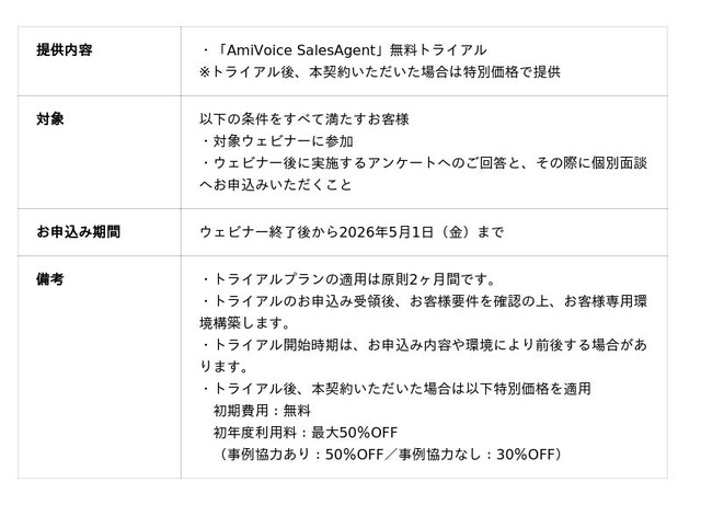 さらに、本キャンペーンでは、「AmiVoice SalesAgent」のトライアル利用後、本契約いただいた場合、初期費用と初年度分の利用料が最大半額となる特別価格でご提供します。