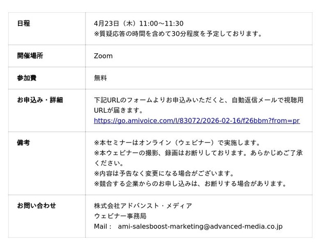 株式会社アドバンスト・メディア(本社:東京都豊島区、代表取締役会長兼社長:鈴木清幸 以下、アドバンスト・メディア)は、国内シェアNo.1(※)のAI音声認識AmiVoiceと生成AI、感情解析を活用し、商談をリアルタイムで支援するソリューション「AmiVoice SalesAgent(アミボイス セールスエージェント)」の正式リリースを記念して、無償トライアルキャンペーンを開催します。