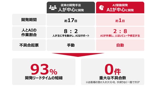 この仕組みにより、従来の人手による開発では17日程度を要していたプロジェクトを、約1日で完了させるとともに、重大な不具合ゼロという優れた品質を両立させることに成功した実際の事例もございます。