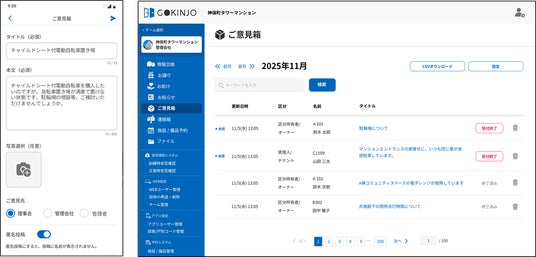 左:居住者向けアプリ画面 右:管理者向けPC画面イメージ