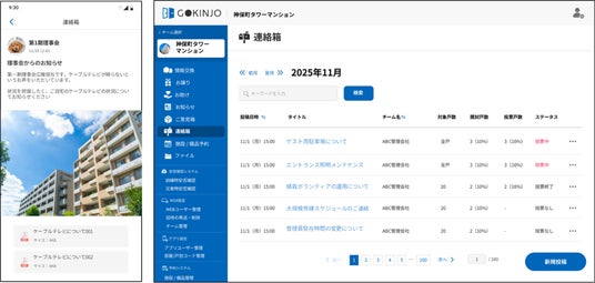 マンション管理運営の現場では、掲示物やポスティングなどのアナログな周知方法により「居住者に情報が届いているか把握できない」といった課題や、居住者の意向確認に多大な労力を要するといった、コミュニケーションの「不透明さ」と「アナログ運用」が大きな課題となっていました。「GOKINJO」はこれまで、居住者間のコミュニティ醸成を主軸にサービスを提供してまいりましたが、さらなる提供価値の拡大に向け、管理運営業務のデジタル化を強力にサポートする管理機能の開発を進めています。これにより、マンション内のコミュニティ形成から管理運営業務までを一元管理できる「マンションDXプラットフォーム」へと領域を拡大いたしました。