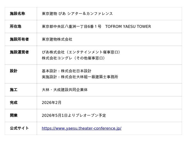 約800名を収容可能な東京駅前初の段床式劇場「東京建物 ぴあ シアター」と、ホール・会議室「東京建物 ぴあ カンファレンス」により構成されます。MICE(国際会議、展示会・イベント、講演会、セミナー等の催事)を中心としたビジネス関連の大規模イベントに加え、これまで東京駅周辺に不足していたエンタテインメント催事による文化芸術発信や、まちと人の結びつきを強める交流の場としての役割を担い、YNK(八重洲・日本橋・京橋)エリアのさらなる活性化と国際都市東京の魅力向上に貢献してまいります。