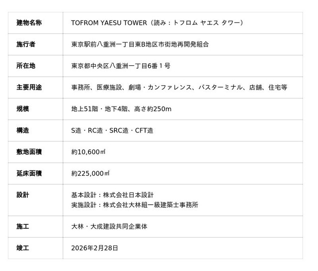 TOFROM YAESU TOWERは、2026年2月28日に竣工した、東京駅八重洲口前に所在する地下4階、地上51階の大規模複合ビル。八重洲地下街(ヤエチカ)を介し東京駅に直結し、オフィス、商業施設、劇場・カンファレンス、バスターミナル、医療施設など多様な用途で構成され、国際都市東京の玄関口にふさわしい都市機能の強化と国際競争力の向上に貢献します。