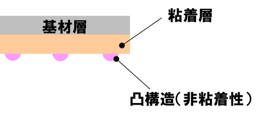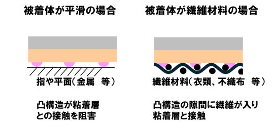 このたび東レが開発した粘着フィルムは、離型紙を使わずに粘着面を保護できる点に特徴があります。粘着層の上にミクロンサイズの凸構造(非粘着部)を設けた立体的な表面構造を採用し、この凸構造が粘着層への不用意な接触を物理的に阻害することで、未使用時のべたつきを防ぎます(図1)。そのため、指や、金属やプラスチックなどの平滑面では、凸部分のみが当たるため粘着層に触れず、さらさらとした触感が保たれます。一方、布や不織布などの繊維製品では、繊維が凸構造の隙間に入り込んで粘着層と接触し、高い密着性が得られます。こうした表面構造の制御により、布にはしっかり貼りつき、平滑面には付かないという選択的粘着性を実現しました(図2)。
