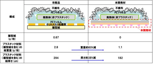 一例として、本開発材を「貼るカイロ」に適用して離型紙レス構成とした場合※4、年間約247tの離型紙ゴミの削減効果が見込まれます。また、既存品に比べ、発熱体を除いたカイロの総重量を約60%、厚みを約38%削減でき、製品のコンパクト化と環境負荷低減を同時に実現します。