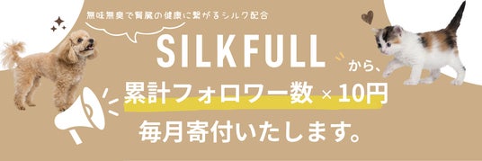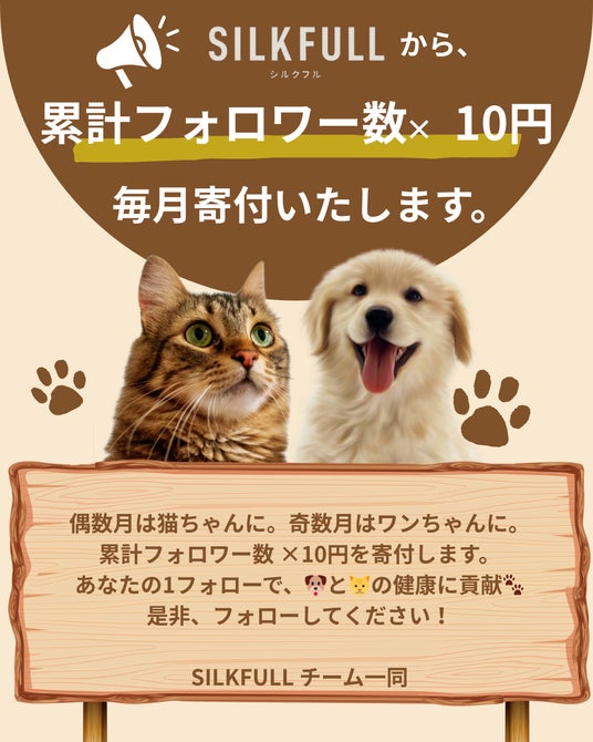 SILKFULL公式Instagramアカウント(https://www.instagram.com/silkfull_pet)のフォロワー数に応じて寄付額が決定される仕組みで、フォローするだけで継続的な支援につながります。