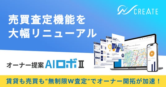不動産テックを推進する日本情報クリエイト株式会社(本社:宮崎県都城市、代表取締役社長:辻村 都雄、以下「日本情報クリエイト」証券コード:4054)は、不動産テック事業を展開する独立系スタートアップのStudio LOC(スタジオ エルオーシー)合同会社(本社:東京都台東区、代表社員:長田 幸洋、以下「Studio LOC」)との共同開発により制作した、賃料査定・空室対策提案ツール「オーナー提案AIロボII」の売買査定機能が2026年4月21日(火) に大幅リニューアルをしました。これにより、1つのシステムで賃料査定と売買価格査定の両方(以下「W査定」)を、月1万円から回数無制限※で行うことが可能となりました。