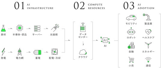 弊社は、最も変化が激しく、成長が見込める「AIバリューチェーン」に対する統合的専門性を有する唯一のファームです。上流のインフラ面は電力からグリッド、通信網、受配電、冷却・空調、または、素材から半導体・電子部品・IT機器。そして、中流の計算資源となるデータセンター・クラウド・AIサービス。最下流はAIの適用先となる代表的な業界群まで。エンドのAI需要が、上流のハード・ソフト・インフラまでどのような影響を及ぼすかを読み解き、クライアントの成長機会を特定し、実現します。