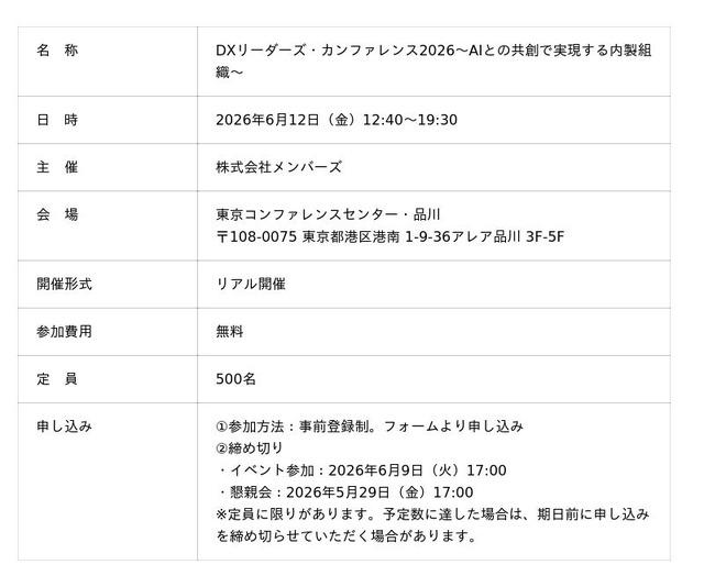 DX現場支援で顧客と共に社会変革をリードする株式会社メンバーズ(本社:東京都中央区、代表取締役社長:高野 明彦、東証プライム:2130、以下「メンバーズ」)は、「DXリーダーズ・カンファレンス2026」を2026年6月12日(金)に東京コンファレンスセンター・品川にて開催します。本カンファレンスでは、「AIとの共創で実現する内製組織」をテーマに、株式会社みずほフィナンシャルグループ、株式会社NTTドコモ、味の素株式会社、Waymo / Googleといった国内外の大手企業10社超のDXリーダーが登壇し、AI活用やアジャイル開発、CX(顧客体験)向上、内製組織やプロセス構築などのリアルな事例を紹介します。また、会場内では大手プラットフォーマーの最新情報や、DX内製化におけるポイントを提供する展示ブースなども展開予定です。