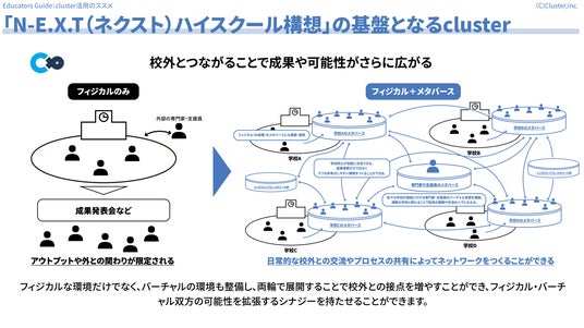 「N-E.X.T(ネクスト)ハイスクール構想」の基盤となるcluster:文部科学省が推進する「N-E.X.T(ネクスト)ハイスクール構想」。本資料では、「N-E.X.T(ネクスト)ハイスクール構想」においてclusterがどのような効果を発揮するのか、clusterを活用した新しい高校の姿のイメージを紹介