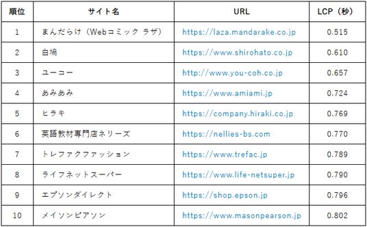 トップ10はすべて0.8秒台以下1位「まんだらけ」はLCP 0.515秒・TTFB 0.138秒という驚異的な数値を記録。トップ5はすべて0.8秒未満で、表示速度の最適な状態と言えます。前月2位だった「白鳩」は今月も0.610秒で2位を維持し、「ユーコー」「あみあみ」「ヒラキ」「エプソンダイレクト」といった常連サイトとともに、安定した高パフォーマンスを継続しています。