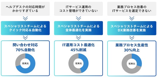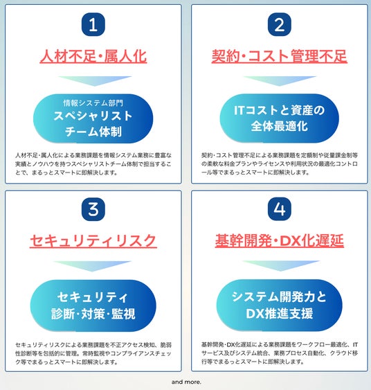 そこで、情報システム課題のソリューション「スマート情シス」の提供を開始しました。本サービスの導入により、スペシャリストチームが顧客企業の情報システム部門として、情報システム業務をまるっとスマートに課題を解決し、持続的な企業成長をワンストップで支援します。